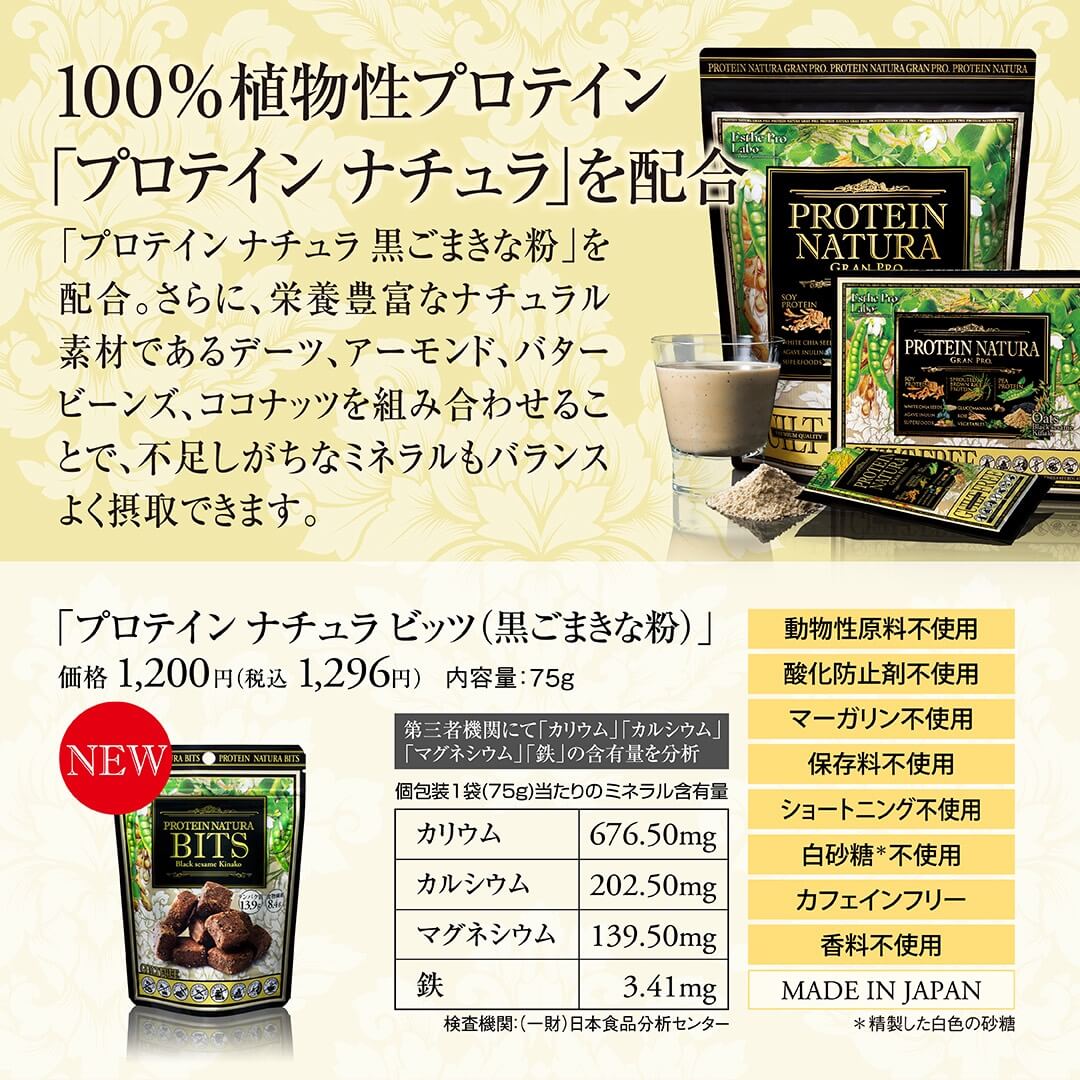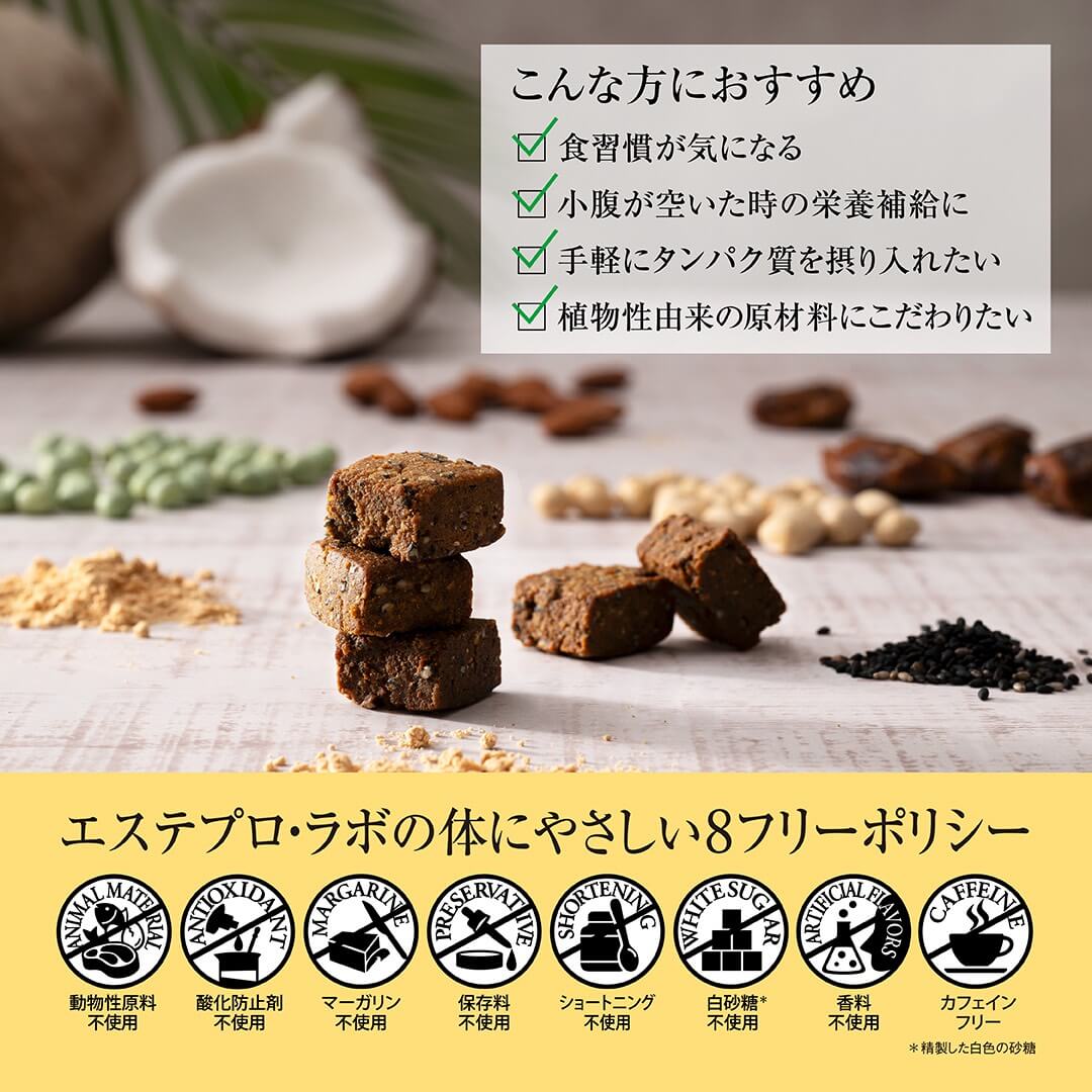 エステプロ・ラボの「プロテインナチュラ」を配合。プラントベース素材にこだわり、8 つのギルトフリーをポリシーにした、手でつまんで食べられるソフトクッキータイプのプロテインスイーツです。